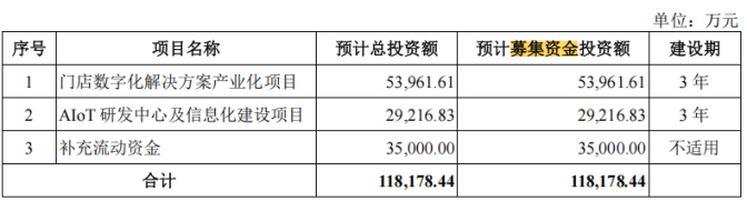 招股书显示,此次IPO,汉朔科技计划募集资金11.8亿元,其中,5.4亿元用于门店数字化解决方案产业化项目,2.9亿元用于AIoT研发中心及信息化建设项目,3.5亿元用于补充流动资金。