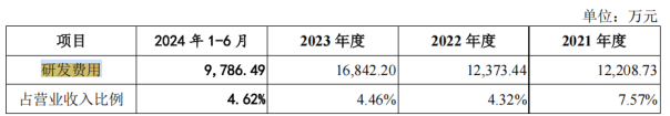 招股书显示,报告期内,汉朔科技的研发费用分别为12208.73万元、12373.44万元、16842.2万元和9786.49万元,占当期营业收入的比例分部位7.57%、4.32%、4.46%和4.62%。