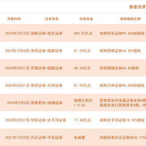 中原证券非银分析师张洋认为,近年来头部券商整体经营稳健,行业集中度维持高位,头部券商之间的体量较为接近、业务布局相似、整体实力差距并不显著,简单通过市场化的方式进行并购重组难以有效解决后期整合难度大的问题。此外,头部券商主要由中央部委、央企、北京及上海地方政府所实控,头部券商之间的并购重组尚需相关政策针对组织架构、人员系统、管理模式等后期整合的难点痛点作出进一步指引。基于以上两点因素,虽然政策鼓励头部券商通过并购重组做优做强,但头部券商对于并购重组的态度整体较为谨慎。2024 年下半年,国泰君安拟吸收合并海通证券引发市场的高度关注,头部券商的并购重组终现破局。