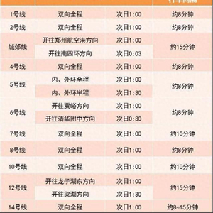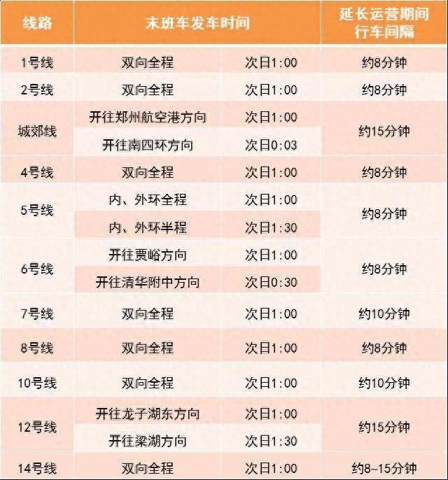 记者从郑州地铁公司了解到,2024年12月31日跨年夜,郑州地铁线网运营时间延长至次日1:00,各线路末班车发车时间及行车间隔详见下表。