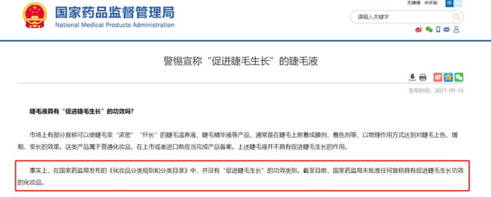 针对以上,国家药监局也曾发文:“有部分宣称可使睫毛变‘浓密’‘纤长’的睫毛滋养液、精华液等产品,通常是在睫毛上附着成膜剂、着色剂等,以物理作用方式达到上色、增粗、变长的效果,不具有促进睫毛生长作用。目前,宣称有睫毛生长功效的化妆品均未获批。”