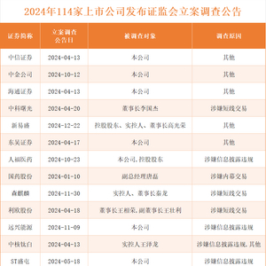 新“国九条”颁布以来,中国证监会紧扣强监管、防风险、促高质量发展的主线,全面落实监管“长牙带刺”、有棱有角。在上述159家上市公司中,有114家的调查人为中国证监会,发布立案调查公告131份。
