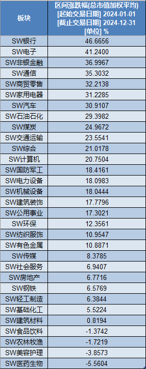 非银金融、通信、商贸零售、家用电器、汽车等板块,2024年涨幅均超过30%,分别上涨了37.00%、35.30%、32.21%、31.23%和30.91%。