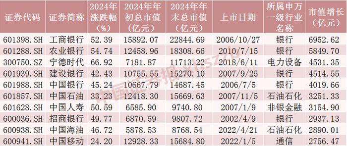 从市值增加角度看,银行股表现大放异彩。数据显示,剔除2024年上市新股后,2024年市值增长最多的10只股票分别为工商银行、农业银行、宁德时代、建设银行、中国银行、中国石油、中国人寿、招商银行、中国海油、中国移动,均为大盘股,其中有5只银行股。工商银行市值增加超6900亿元,2024年股价上涨52.39%。
