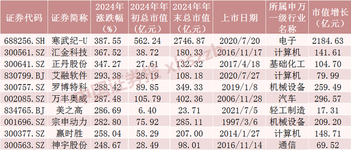 整个2024年,Wind数据显示,剔除当年上市的新股,A股共有2194只股票涨幅为正,329只股票涨幅超过50%。2024年涨幅最大的10只股票分别为寒武纪-U、汇金科技、正丹股份、艾融软件、罗博特科、万丰奥威、美之高、宗申动力、赢时胜、神宇股份,其中涨幅最大的寒武纪-U累计上涨387.55%,汇金科技、正丹股份均涨逾340%。