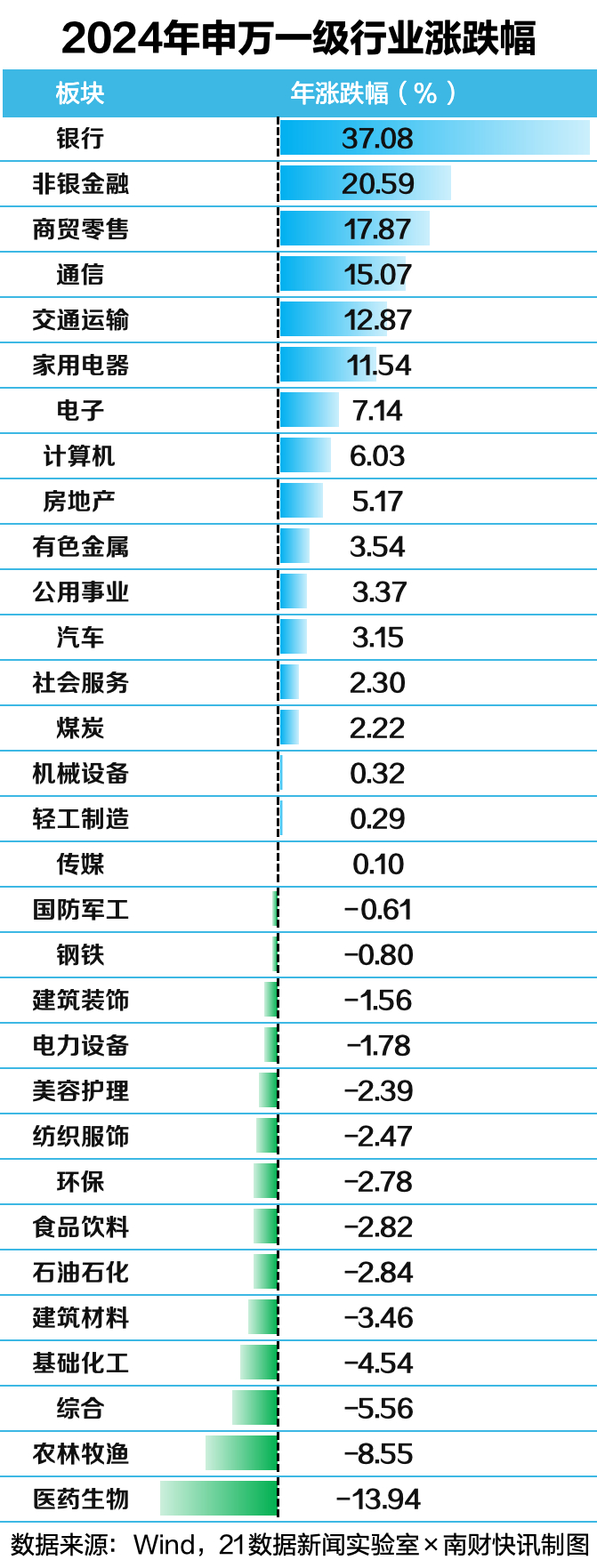 从申万一级行业板块来看,Wind数据显示,2024年全年,A股31个行业整体涨多跌少。银行板块以37.08 %的全年涨幅领跑,同为红利板块的非银金融紧随其后,全年涨超20%。商贸零售和通信行业全年分别上涨17.87%和15.07%。