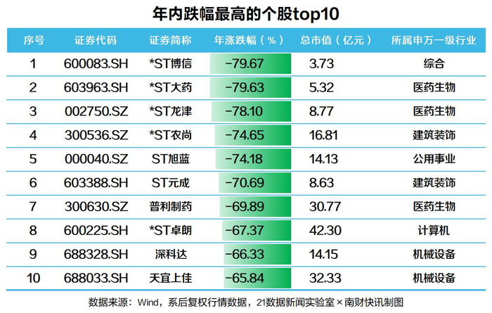 反观年跌幅,共有76只股票全年下跌超过50%,其中19只跌幅超过60%。行业分布上,在跌幅top10中,一半属于生物医药或房地产周期链条行业。