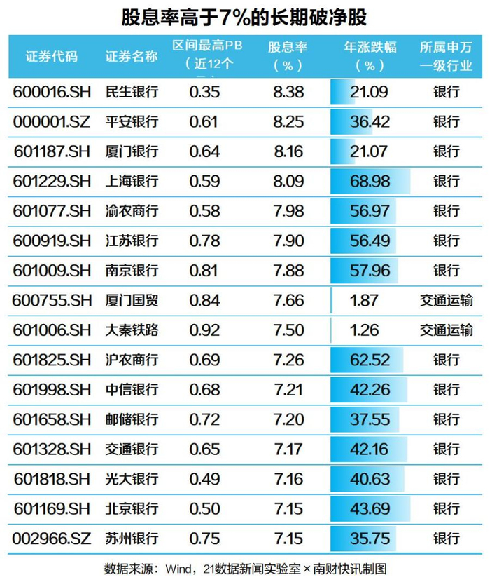 有业内人士认为,高股息率的长期破净股,更有望寻找到有价值标的。光大证券也曾在研报中表示,市值管理深入推进,持续看好高股息板块长期价值。Wind数据显示,截至12月31日收盘,共有16只股息率(TTM口径)高于7%的长期破净股。