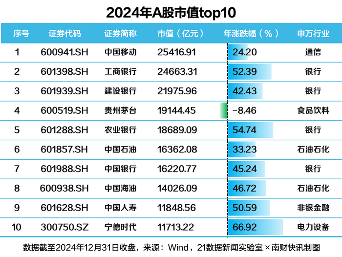 值得关注的是,A股“股王”贵州茅台的总市值被中国移动、工商银行、建设银行超越。工商银行市值超越贵州茅台的同时,年内股价涨幅更是高达52.39%。