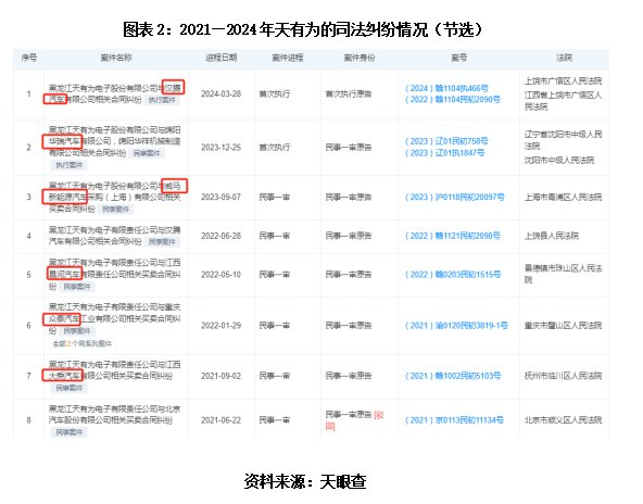 天眼查显示,2021—2024年,江西大乘汽车有限公司、汉腾汽车有限公司、绵阳华瑞汽车有限公司、江西昌河汽车有限责任公司、重庆众泰汽车工业有限公司、四川野马汽车股份有限公司、威马新能源汽车采购(上海)有限公司等企业相继被天有为起诉,案由为合同纠纷、买卖合同纠纷等。
