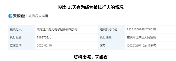天眼查显示,2023年2月,天有为被重庆市江津区人民法院列为被执行人,执行标的金额高达718.28万元,案号为(2023)渝0116执1690号,立案日期为2023年2月10日。