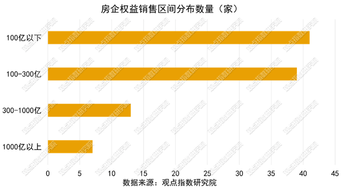 销售门槛值方面,1-12月,前10、前30、前50房企的权益金额门槛值分别约为677亿元、228亿元和124亿元。可以看到,有7家房企突破千亿门槛,比2023年减少4家。300-100亿有13家,同比减少8家,100-300亿有39家,同比减少2家,100亿以下41家。