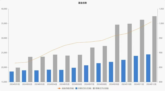 2024年,A股ETF经过20年的发展,市场迎来大扩容,ETF总规模突破3万亿元,ETF产品数量突破1000只。此外,权益类ETF规模先后突破2万亿元、3万亿元大关,被动基金的A股持股规模首次超越主动权益基金。