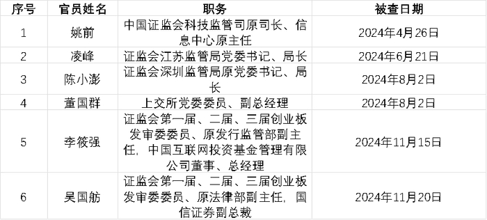 4月,中央第八巡视组分别对中国证监会党委、上海证券交易所党委、深圳证券交易所党委开展三个月左右的巡视。此后,证监会科技监管司司长兼信息中心主任姚前、江苏证监局原党委书记、局长凌峰、上海证券交易所党委委员、副总经理董国群、证监会深圳监管局原党委书记、局长陈小澎、证监会原发行监管部副主任李筱强、证监会原法律部副主任吴国舫先后被查。