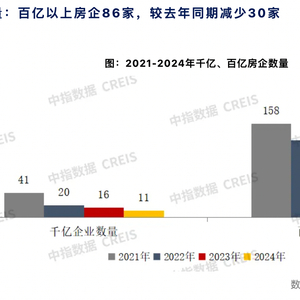 在房企销售规模方面,2024年销售总额超过千亿的房企有11家,较去年同期减少5家,销售额均值为2001.4亿元;销售额超过百亿的房企有86家,较去年同期减少30家。