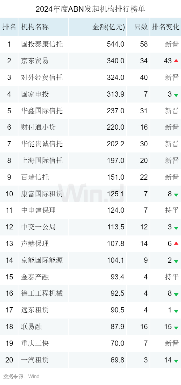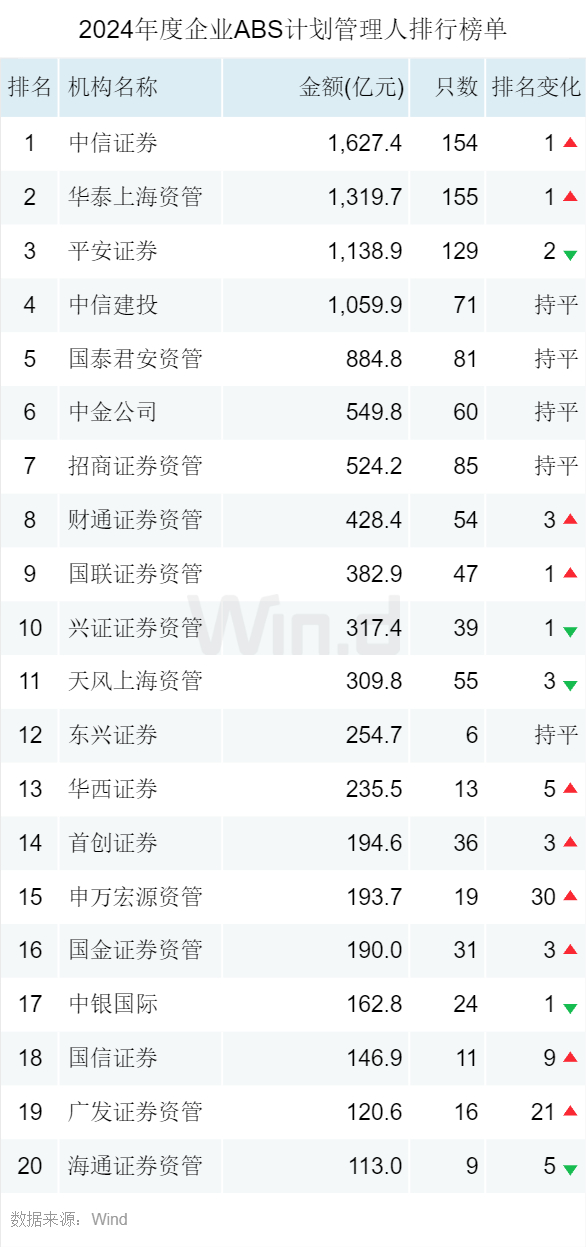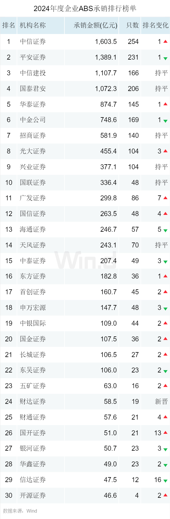 中信证券跃居企业ABS承销规模总榜首,2024年度共承销254只项目,总承销金额1,603.5亿元;平安证券承销了231只项目,总承销金额1,389.1亿元居第二位。