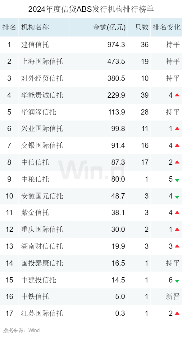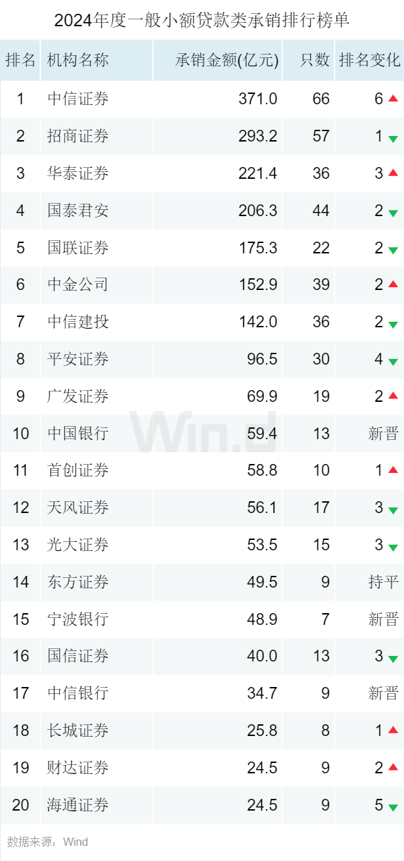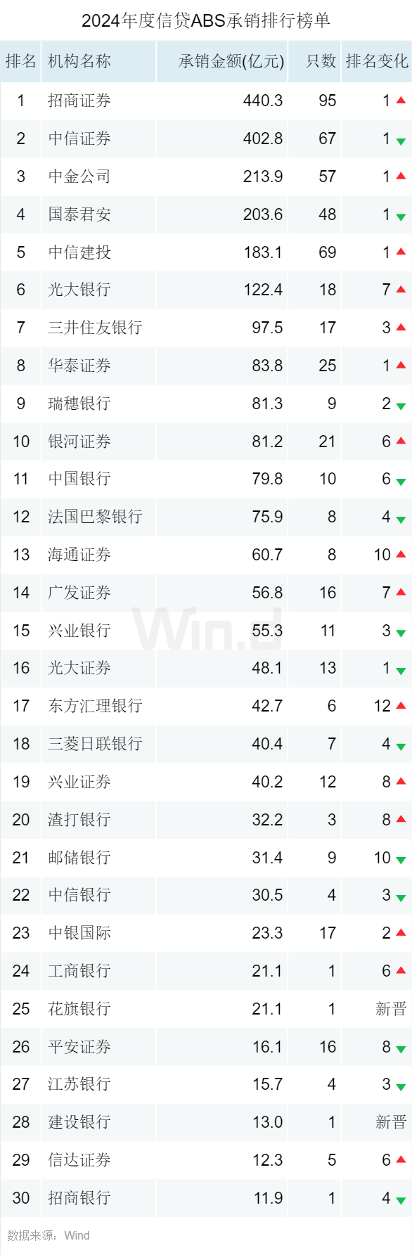招商证券跃居信贷ABS承销规模总榜首,2024年度共承销95只项目,总承销金额440.3亿元;中信证券承销了67只项目,总承销金额402.8亿元,居第二位。