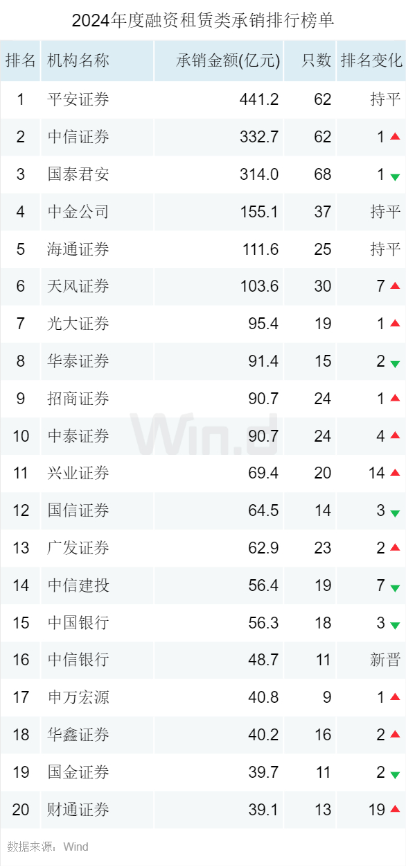 平安证券承销441.2亿元,领跑融资租赁类ABS承销榜;中信证券承销332.7亿元,跃居第二;国泰君安承销314.0亿元位列第三。