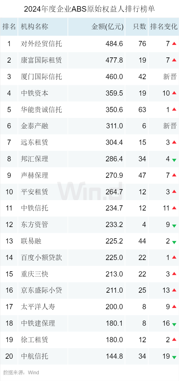对外经贸信托发行484.6亿元升至榜首;康富国际租赁以477.8亿元居次席。