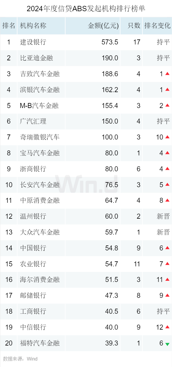 建设银行以573.5亿元承销规模位居信贷ABS市场发起机构榜首,比亚迪汽车金融、吉致汽车金融分别以190.0亿元和188.6亿元位居二三。