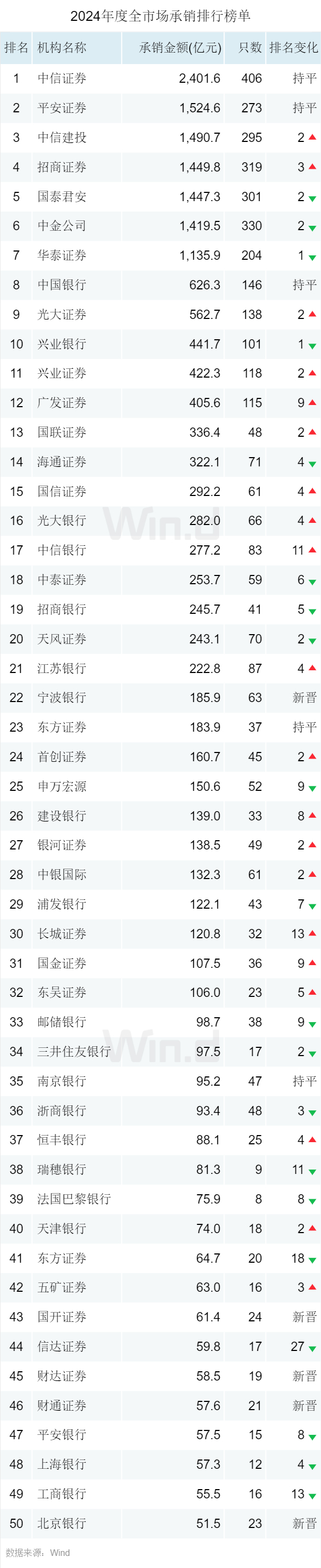 2024年中信证券共承销了406只项目,总承销金额2,401.6亿元,位居第一;平安证券承销了273只项目,总承销金额1,524.6亿元,位居第二位;中信建投承销295只项目,总承销金额1,490.7亿元,名列第三位。