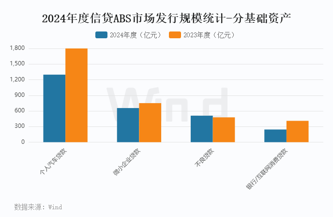 其中,信贷 ABS 新增发行192只项目,发行总额为2,704亿元,较去年同比减少23%。从基础资产方面来看,个人汽车贷款发行量最大,发行32只,共计1,297亿元;微小企业贷款次之,发行13只,共计655亿元。