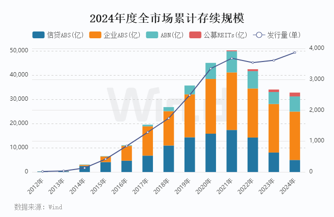 截至2024年12月31日,市场累计存量规模约32,777亿元。其中,信贷ABS存量规模4,958亿元,企业ABS存量规模19,976亿元,ABN存量6,257亿元,公募REITs存量1,587亿元。