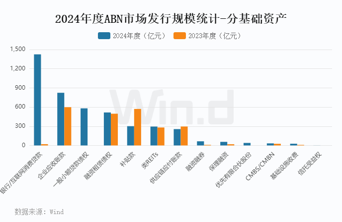 ABN发行570只,发行总额为5,243亿元,较去年同比增加63%。其中银行/互联网消费贷款发行175只项目,共计1,425亿元;企业应收账款次之,发行91只项目,共计824亿元。