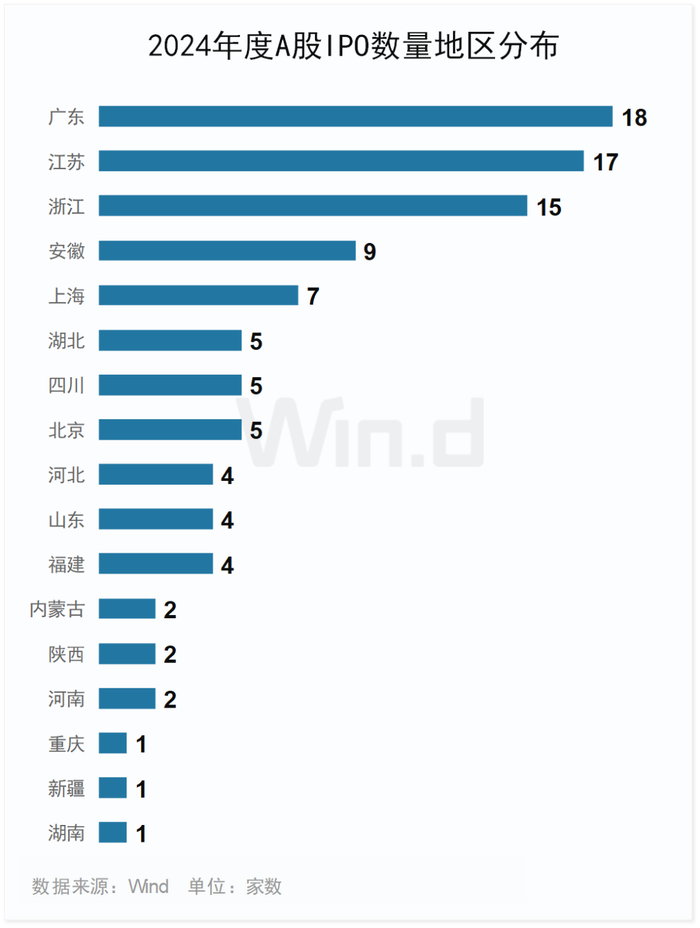 2024年A股IPO发行的102家公司中,来自广东的公司共有18家,数量居首;来自江苏的公司共有17家,浙江、安徽、上海分别有15家、9家、7家公司发行。