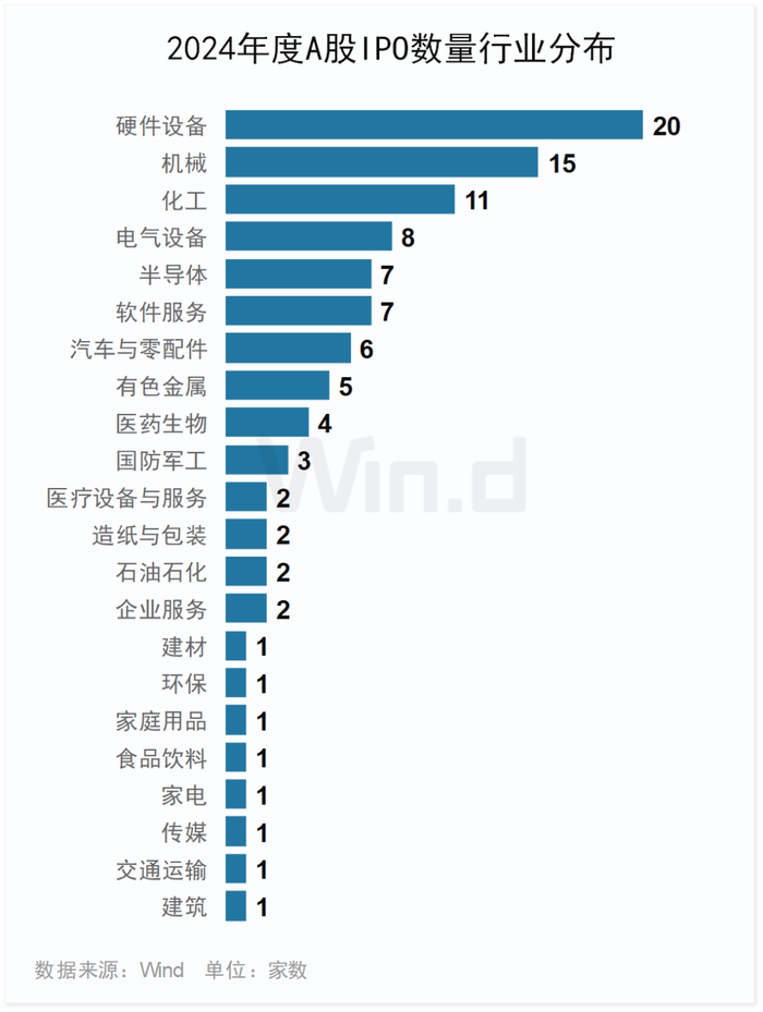 2024年A股IPO发行的102家公司中,来自硬件设备行业的公司有20家,数量居首;来自机械、化工行业的公司分别有15家、11家。