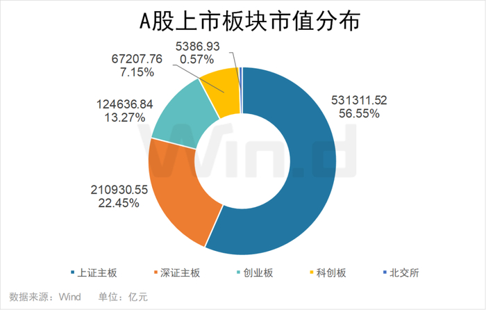 截至2024年末,上证主板上市公司市值合计531311.52亿元,占比达到56.55%;深证主板上市公司市值合计为210930.55亿元,占比为22.45%。