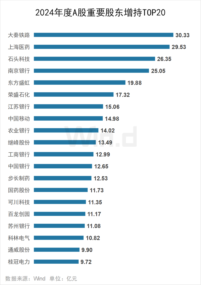 2024年大秦铁路获重要股东增持30.33亿元,位居增持榜榜首;上海医药紧随其后,获重要股东增持29.53亿元,石头科技、南京银行均获重要股东增持超25亿元。