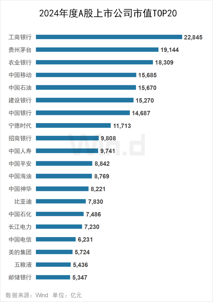 截至2024年末,工商银行位居上市公司市值榜榜首,总市值达22845亿元;贵州茅台紧随其后,总市值为19144亿元;农业银行、中国移动、中国石油、建设银行、中国银行、宁德时代总市值均超万亿。