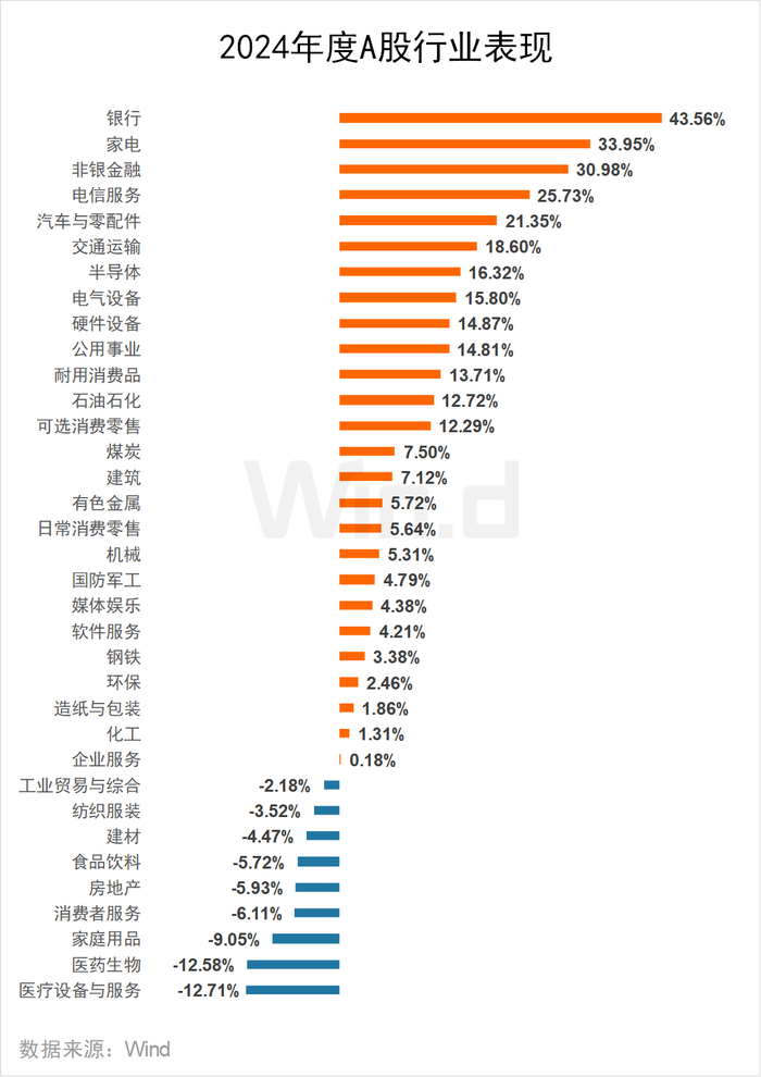 在Wind二级行业分类的35个行业中,2024年共有27个行业录得上涨。银行业涨幅居首,全年上涨43.56%;家电、非银金融、电信服务分别上涨33.95%、30.98%、25.73%。医疗设备与服务行业表现垫底,全年下跌12.71%;医药生物、家庭用品行业分别下跌12.58%、9.05%。