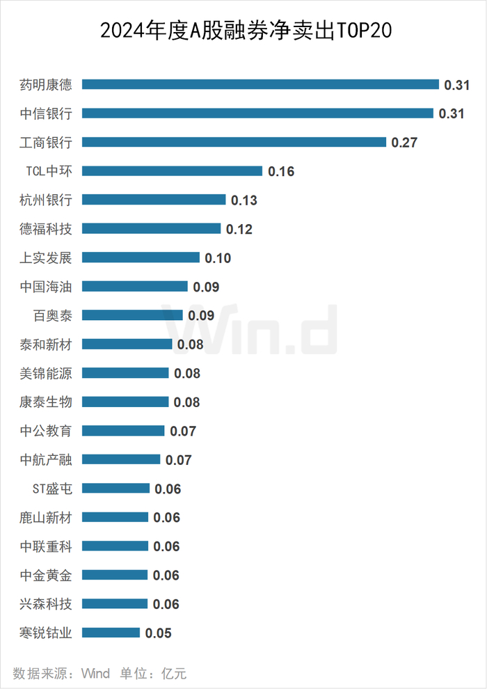 2024年药明康德遭融券净卖出0.31亿元居首;中信银行、工商银行分别遭融券净卖出0.31亿元、0.27亿元。