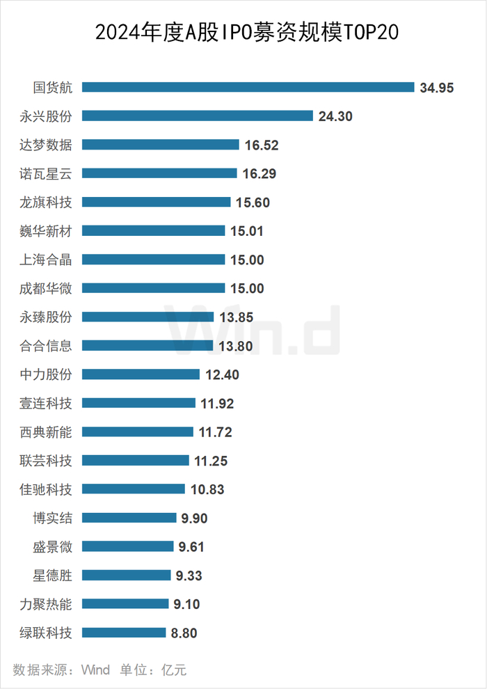2024年A股IPO发行的102家公司中,国货航IPO募资规模居首,为34.95亿元;此外,永兴股份、达梦数据、诺瓦星云、龙旗科技、巍华新材等14家公司的IPO募资规模均超10亿元。