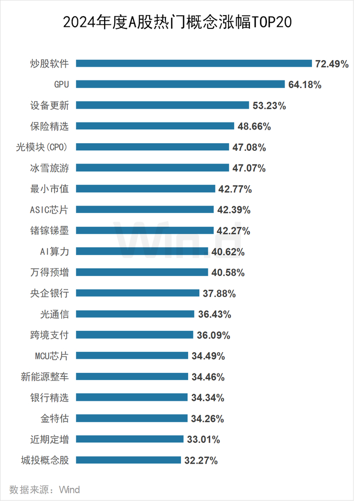 2024年大金融、人工智能、新能源等概念表现强势。炒股软件概念涨幅居首,全年上涨72.49%,GPU、设备更新概念分别上涨64.18%、53.23%。