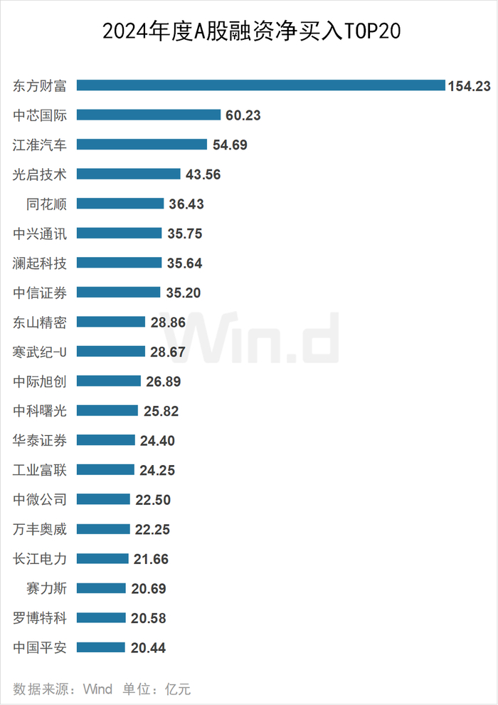 2024年东方财富获杠杆资金大幅加仓,融资净买入额达154.23亿元居首;中芯国际、江淮汽车均获融资净买入超50亿元。