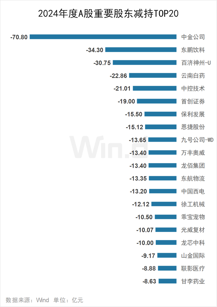 2024年中金公司遭重要股东减持70.8亿元,位居减持榜榜首;东鹏饮料、百济神州均遭重要股东减持超30亿元,分别为34.3亿元、30.75亿元,云南白药、中控技术均遭重要股东减持超20亿元。