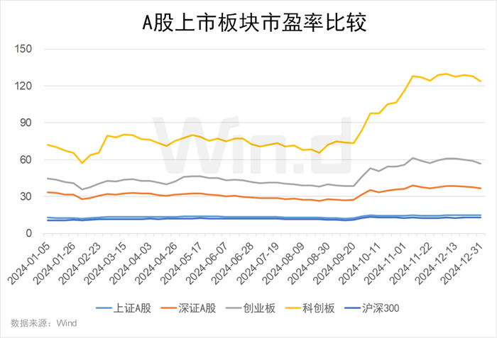 截至2024年末,科创板市盈率最高,为123.63倍;创业板、深证A股市盈率分别为56.71倍、36.73倍;上证A股、沪深300的市盈率较低,分别为14.67倍、12.93倍。