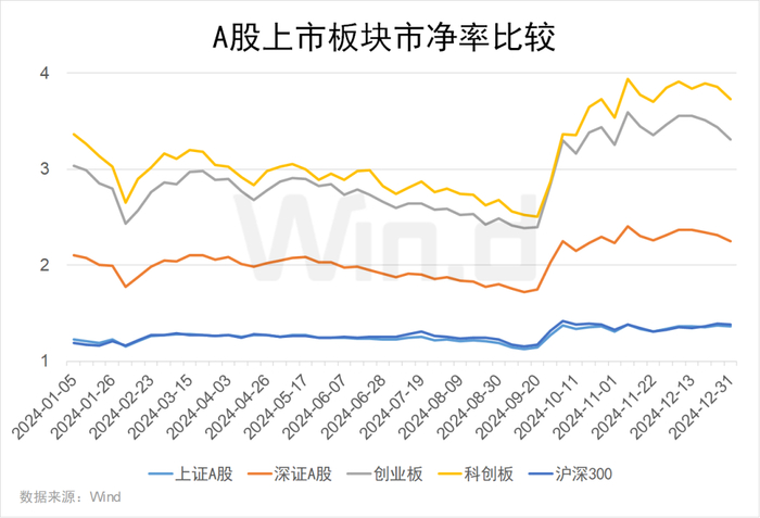 截至2024年末,科创板市净率最高,为3.73倍;创业板、深证A股市净率分别为3.31、2.25倍;沪深300、上证A股的市净率较低,分别为1.38倍、1.36倍。