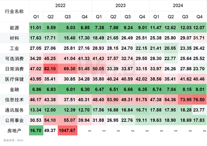 截至2024年末,在Wind一级行业分类的11个行业中(因2022年四季度以来房地产行业持续亏损,不予计算),信息技术行业的市盈率最高,为76.50倍;金融行业的市盈率最低,为8.01倍。