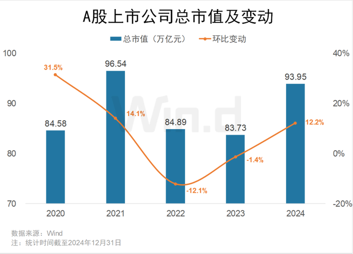 截至2024年末,A股市场总市值约93.95万亿元,较2023年末增长12.2%。
