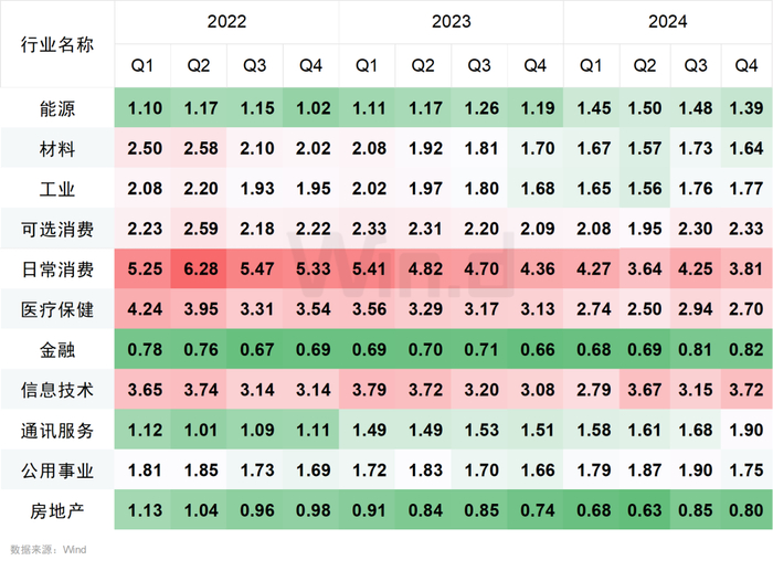 截至2024年末,在Wind一级行业分类的11个行业中,日常消费行业的市净率最高,为3.81倍;金融、房地产行业均破净,市净率分别为0.82倍、0.78倍。
