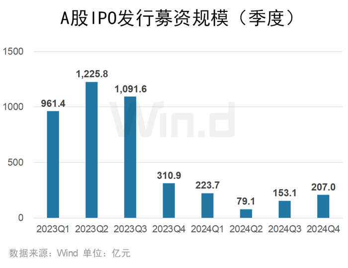2024年A股市场IPO募资规模为662.8亿元,较2023年下降81.53%。其中四季度IPO募资207.0亿元,较三季度IPO募资规模环比上升35.21%。