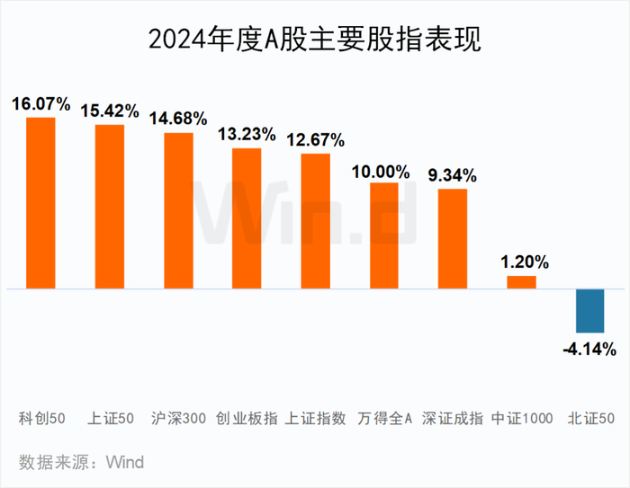 2024年A股主要股指多数上涨。科创50指数表现最强,全年上涨16.07%;上证50指数紧随其后,上涨15.42%;北证50指数全年下跌4.14%。