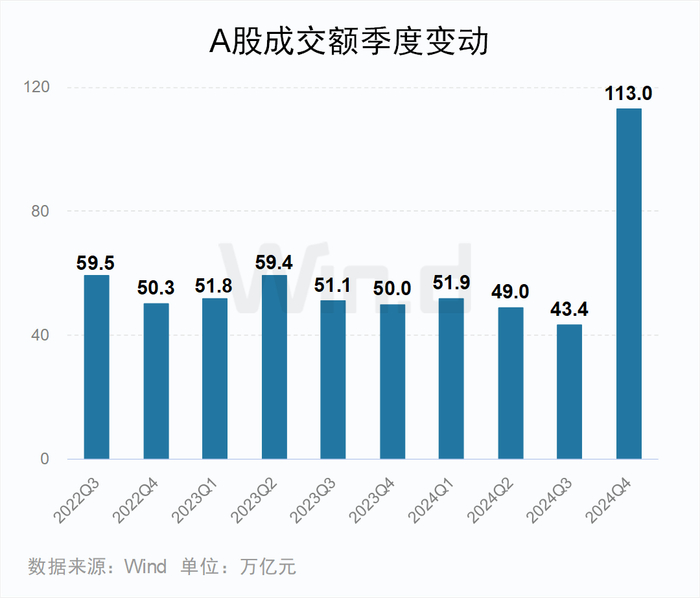 2024年A股市场总成交额为254.7万亿元,相比2023年增长21.20%;第四季度总成交额为113万亿元,环比增长160.37%;日均成交额为18684亿元,环比增长172.08%。