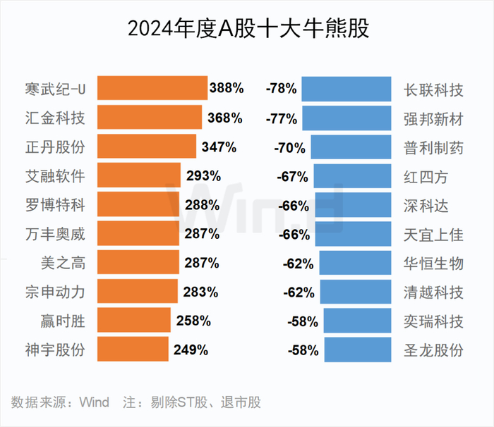 2024年寒武纪全年上涨388%,位居涨幅榜榜首;汇金科技、正丹股份分别上涨368%、347%。长联科技全年下跌78%,位居跌幅榜榜首,强邦新材、普利制药分别下跌77%、70%。