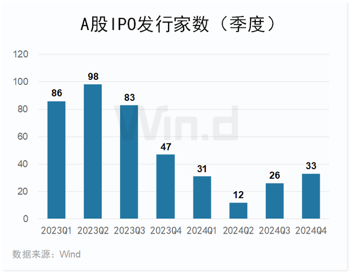 2024年A股市场IPO发行数量为102家,较2023年下降212家。其中四季度共发行33家,较三季度发行家数环比上升26.92%。