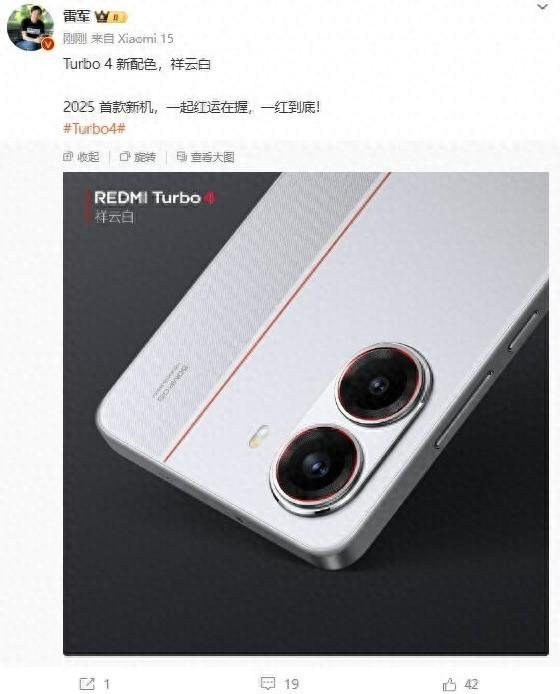 小米创始人雷军近日在微博上分享了备受瞩目的2025年首款新机——REDMI Turbo 4的最新消息,并满怀热情地宣布:“2025首款新机,一起红运在握,一红到底!”这一消息瞬间引发了广大网友的热烈讨论和高度期待。
